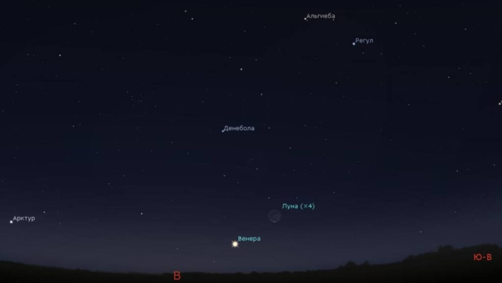 Жители республики получат возможность наблюдать Венеру и Луну на рассвете 19 октября около 6:30 утра. На востоке, невысоко над горизонтом в созвездии Девы, появится чрезвычайно яркая Венера и крайне тонкий лунный серп. Спутник Земли взойдет в 5:30, а Венера присоединится к нему спустя тридцать минут. Поскольку до новолуния останется два дня, солнечный свет осветит лишь 5% лунного диска. Для успешных наблюдений за небесными телами необходим открытый восточный горизонт.